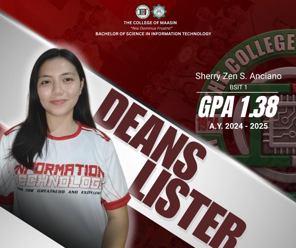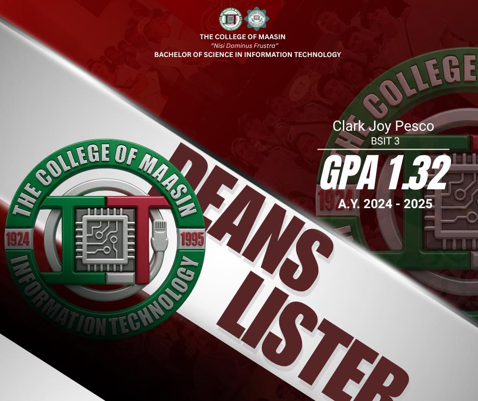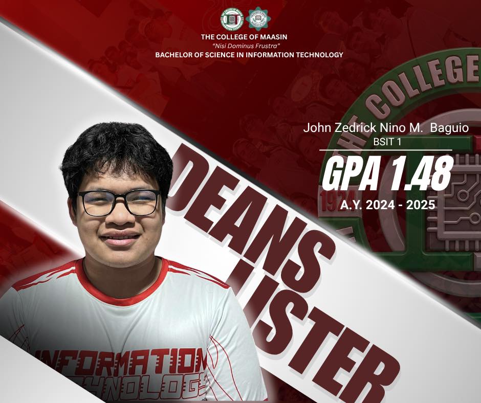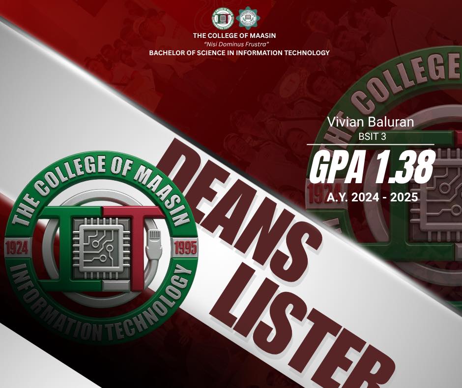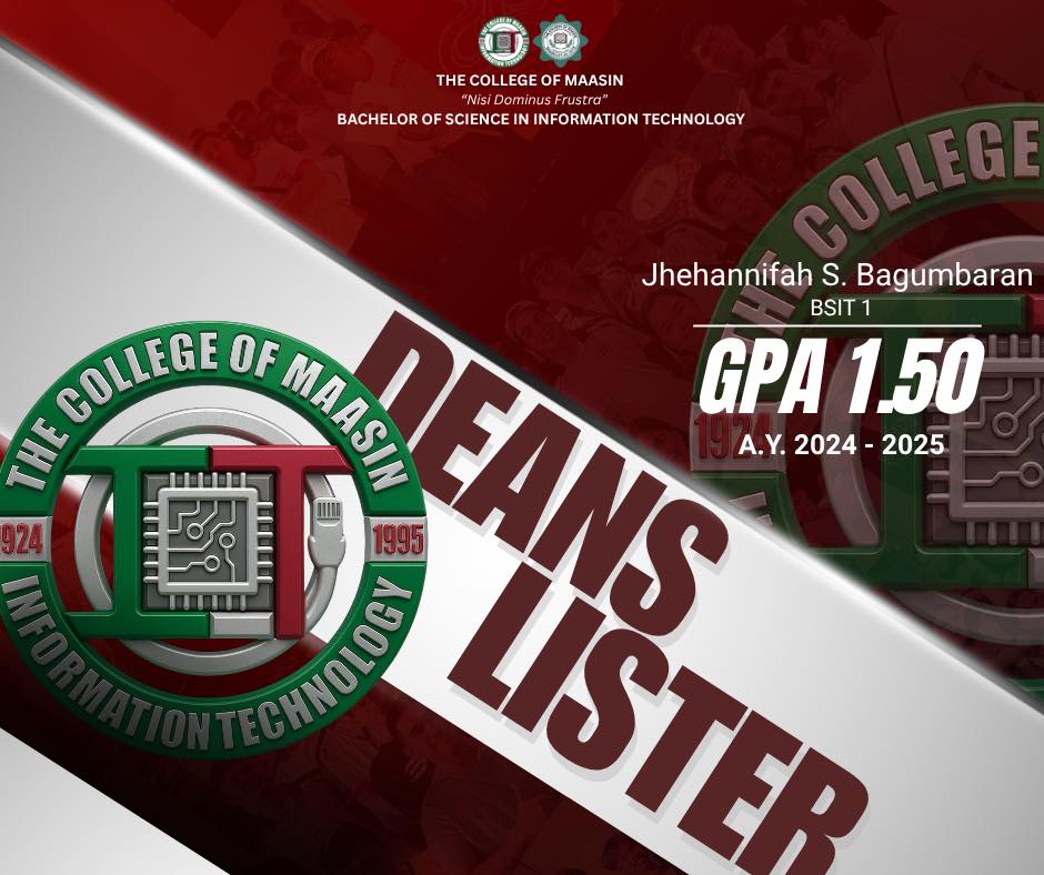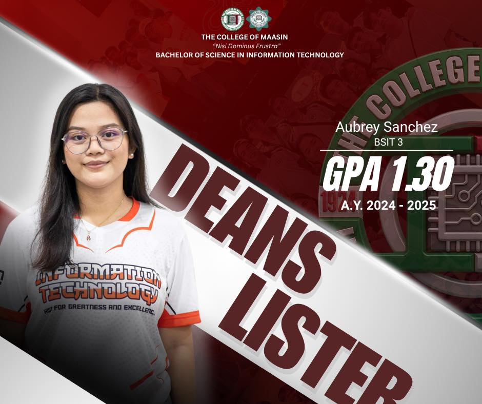The BSIT Department proudly honors the exceptional students of the Bachelor of Science in Information Technology (BSIT) program who earned a place on the Dean’s List for the 2nd Semester of Academic Year 2024–2025.